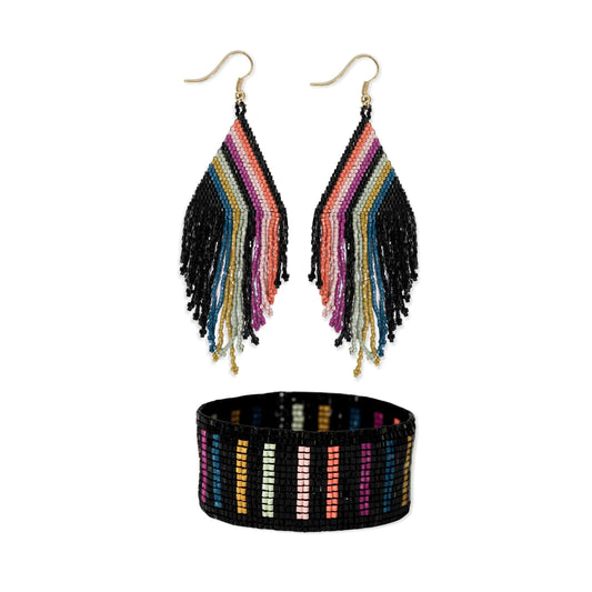 Haley + Kenzie vertical falling lines beaded earrings and bracelet set Rainbow/Black