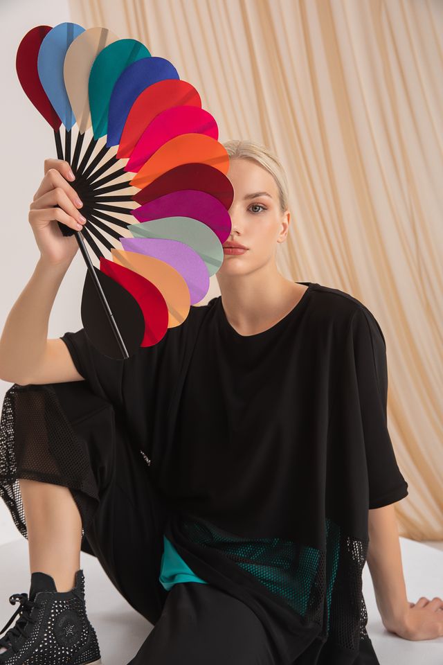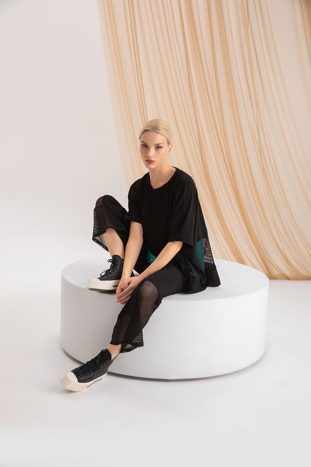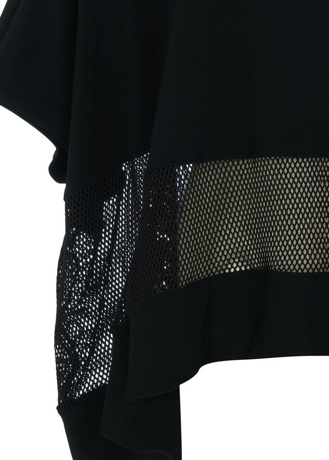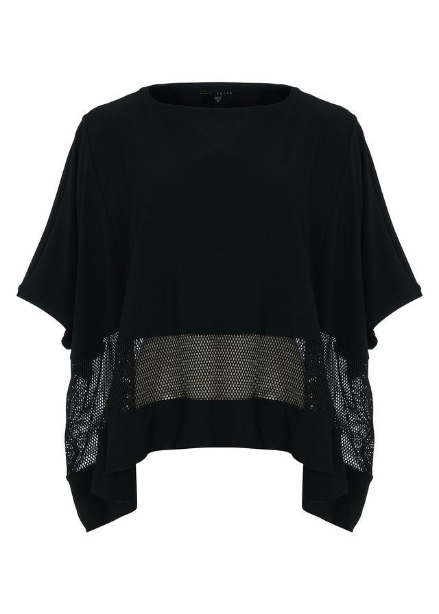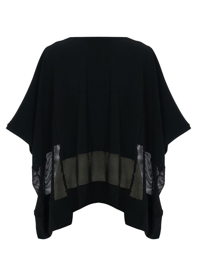 Effortlessly chic, this flowy black top features a relaxed silhouette with a mesh inset for a subtle, modern edge. Lightweight, it adds movement and contemporary style to any outfit.