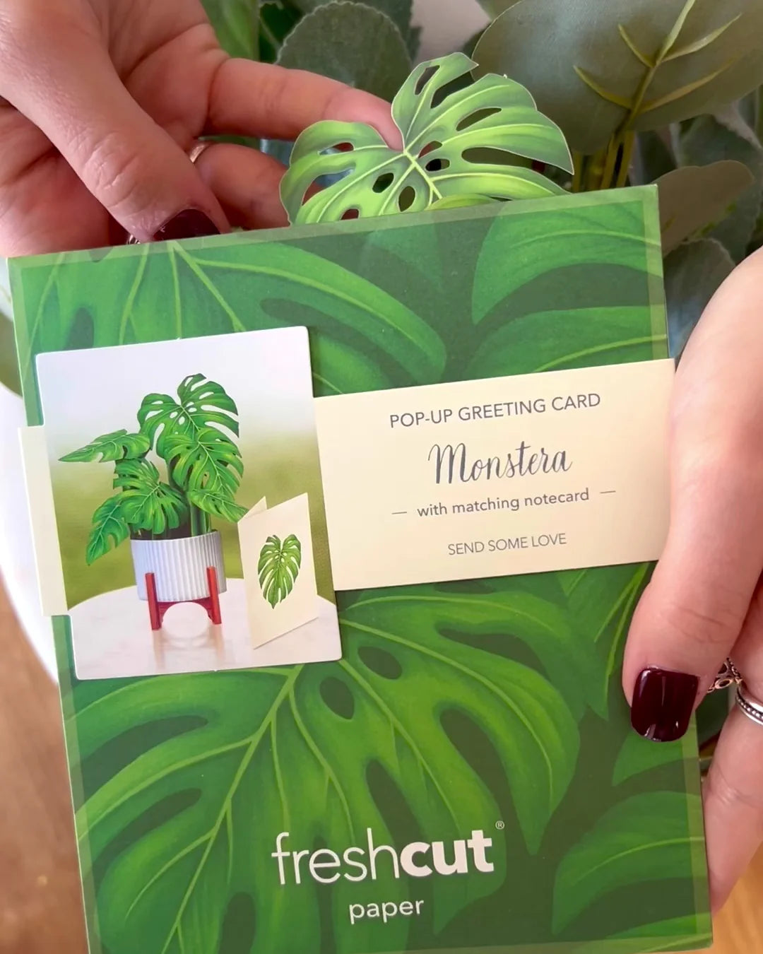 The Mini Monstera Plant is small statement piece for your home, complete with a mahogany wood stand and modern white planter. Whether you’re looking to ease your mind and enhance your home or send soothing sentiments to those who need it, this paper plant brings serenity to every space it inhabits.