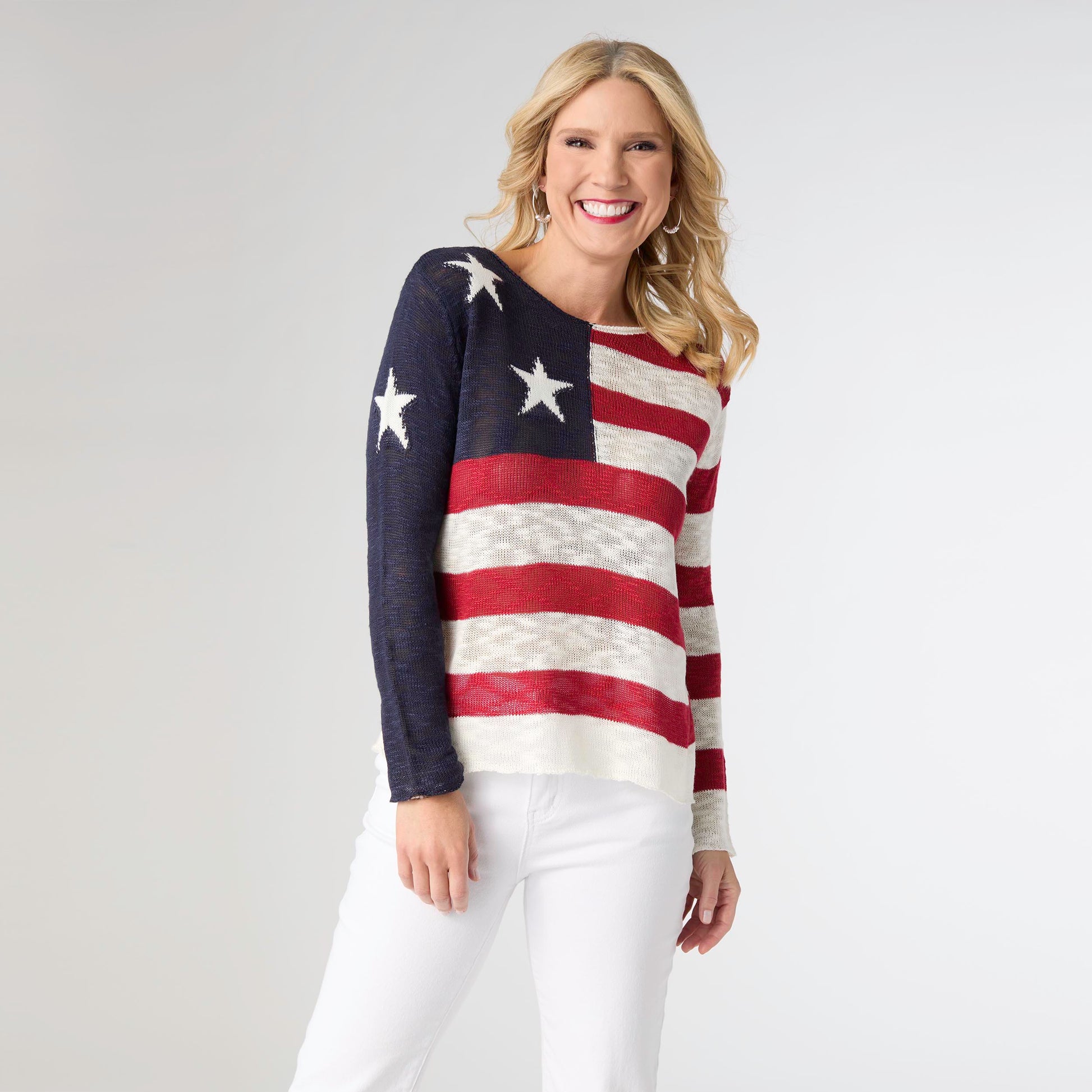 Add a touch of Americana to your wardrobe with our Muriel Burnout Flag Sweater! This versatile long sleeve layering piece is a must-have for any 4th of July celebration. Stay cozy and stylish all summer long with this patriotic sweater.