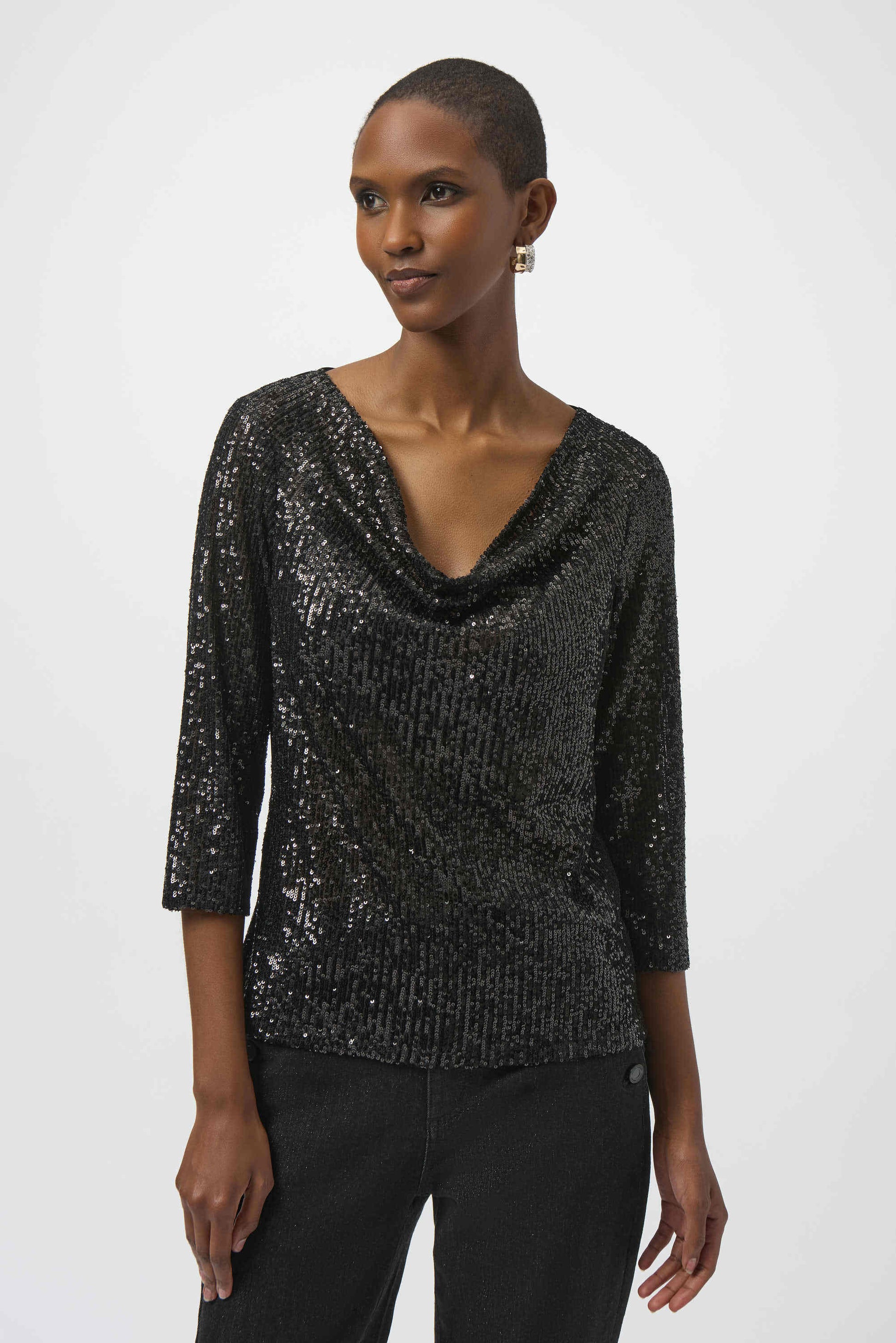 The sequined silky knit fabric lends this top its mesmerizing allure. The chic cowl neck and three-quarter sleeves add a refined touch to the piece’s timeless straight silhouette.